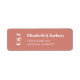 Den här minsta returadressetiketten för bröllopsinbjudan visar namn i fet typografi i vitt på en terracotta-bakgrund, med adress nedan i modernt sans serif-teckensnitt. Lägg till initialer vertikalt på den lämnat kant.