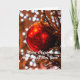 Röd julprydnad boll täckt med kopp av färsk snö mot vit ljus belyst bakgrund. Smakfull och glatt stämning. Hälsningskort. Du kan ändra eller ta bort bilden och texten på framsidan God jul och Gott nytt år! samt den inre texten Låt hälso-, Kärlek och välfärden vara med dig! Vertikalt orienterat kort.