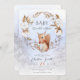 Den här babyduschinbjudan är söt och enkel. En liten ekorre äter rosehöftbär, som symboliserar lycklig spädbarn och omges av bomullsblommor. Skogen snö och gräs återspeglar naturen.