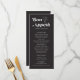 De här vintage-stil 4-tums x 9-tums middagsmenyerna i bröllop har vit text med en stiliserad rubrik, "Bon Appetit", i stort vitt brev med en hjärtaccent på svart bakgrund. Menyn har platshållare för två aptiserare, två poster, två öknar och bröllop par namn. Hex färg, vit-fbfbfb och svart-231f20.