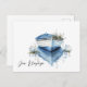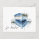 Ett vackert minsta Bon Voyage-vykort av en blå rowboat omgiven av blåa blommor.