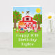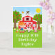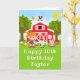 Den här söta och roliga födelsedagskortet kan personifieras med namn eller titel såsom dotter, sondotter, systerdotter, väninna osv. Den har en rödhårig flicka med ljus hy bredvid en röd lada med en väderflöjel i form av en tupp. Det finns söta lantdjursdjur såsom en ko, gris och höna. I bakgrunden syns en klarblå himmel, äppelträd, solsken, fjärilar och tusenskönor. Texten kombinerar fetstil och sans serif-teckensnitt för en stilren och modern look. Detta är perfekt för en födelsedagsfest med lantbruks tema.