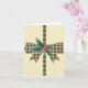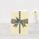 Vackert julkort med lantlig bondgårdsstil vintage plaidband och båge med vintergrangren och bärdekoration på krämfärgad burlapbakgrund.