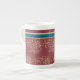 En elegant china Kaffe Mugg med ben, med formaliserat blommönster och rand med rullstol i beige och mörk blått på en rik med burgundbakgrund.