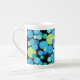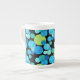 Benet China Mugg, med en abstrakt, över mönster av blått, turkos och grönt "måne mot svart bakgrund, från en handmålad papper kollage av Judy Adamson.