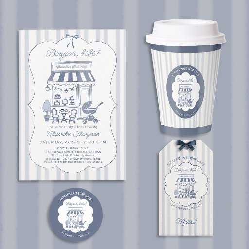 Bonjour Bebe Coffee Brunch Dusty Blue Baby Shower Inbjudningar