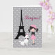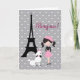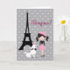Det här chic-kortet har en grått- och rosa hjärtbakgrund med Eiffel Torn, en söt pudel och den finaste flickan med Fransken hälsning "Bonjour!".