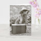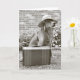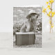 sepia färgad guld- retriever med takten upp sugrörhatten på och gammal resväska vid hans sidoredo som reser
