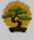 Ett vackert exempel på en bonsai träd som sitter i en svart pott mot en ljus gult-cirkulär bakgrund.