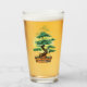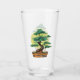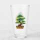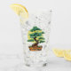 Traditionell vattenfärgsdesign för ett japanskt bonsai-träd framför starkt gult sol på ett dricksglas.