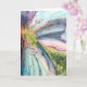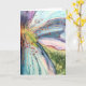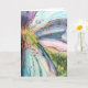 En makronära vy av insidan av en tropisk blomma. Den abstrakta designen i färg har ett dynamiskt linjer som kommer från en central punkt, med små orangar som kräver att bina uppmärksammas. Variationer i blått, violett och rosa, blandning för att skapa blå petaler och grönt bakgrund. Flytande, organiska former skapar en känsla av rörelse och energi, som blandar blått, grönt, lila och gult i många. Blanka hälsningskort är ett underbart sätt att uttrycka personliga känslor.