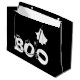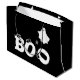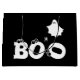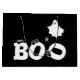 Den grumliga och roliga, vita Halloween-grafiken med ord "BOO" tittar vid ett spöke som drar en spindel med skrämt ögon.