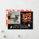 Modern minimal boo från vårt gäng Halloween-foto julkort. Rolig orange och svart retro fet grafisk typografi med retro stjärnor design på en svart bakgrund. Skicka ett roligt modern minimal retro-stil julkort till vänner och familj. Lägg till ditt semestefoto och ditt anpassade meddelande, namn och år. Bedårande spök-mönster på baksidan. Foto med tillstånd av @casa_de_frenchies_ ©Marisu Valencia