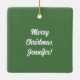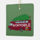 Har en illustration av en festive-mobil. Mörken Red fordon är dekorerad med ljus under julen och har ett Julgran vid tak. På baksidan av den här ornamenten är en punkt där du kan lägga till ett eget anpassningsbar-meddelande i vitt skript eller kursiv skrift.
