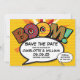 En rolig, cool och trendig retro tecknad serie popkonst-inspirerad spara datumet inbjudan som sätter BAM, ZAP, POW i alla evenemangsinbjudningar. Perfekt för bröllop, möhippa, baby shower, dop, förlovningsfirande, årsdagar, examen, födelsedagsfester och andra speciella evenemang under året! Designad av ComicBookPop© på www.zazzle.com/comicbookpop