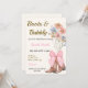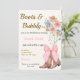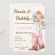 The Boots and Bubbly bridal shower invitation is designed with brown cowgirl boots, a pink bow, colorful flowers, pink, brown, and black text, and a tan background.