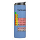 Drick kaffe med jämna mellanrum med denna vetenskapliga termisk tumlare, med en enkel version av 2016 års periodiska Bord i Inslag, inklusive de fyra nyaste inslag (113 Nihonium, 115 Moscovium, 117 Tennessine och 118 Oganesson)! Bakgrunden är en alfabetisk lista över alla 118 inslag. Öppna anpassningsredigeraren för fullt för att ändra färg i flaska!