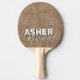 Personlig bord-tennis-paddle med namn i coola bruna typsnitt stil med svart skugga, över brunt läderbakgrund... en coola visuell identitet för snyggt spelare.