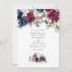 Bröllopsinbjudan med marinblå, vita och vinröda peonior och rosor med elegant typografi. Perfekt för alla teman eller trädgårdsbröllop. QR-koden på baksidan dirigerar till er bröllopssida där folk kan lära sig mer och svara.