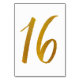 Bordsnummer 16: Det här avslappnad-bordsnumret för penselskriptet är angivet i en faux guld-folie. VIKTIGT: Det utseende på folie som visas är en tryckt effekt. Det är ingen riktig folie. Om du inte vill ha den här effekten kan du ta bort den på följande sätt: 1) Klicka på "Anpassa ytterligare". 2) Hitta den bild som står i z-guld-folie och ta bort den. Välj sedan ditt eget färg i färger i bakgrunden.