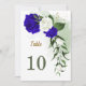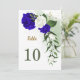 vackra blåblommor och vita blommor med grönt löv och guld bordsnummer kort för royal