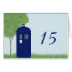 Quirky and roligt Police Box Bröllop-Bordsnummer-kort med en briljant blå vintage-polisbox i söt fält med träd i bakgrunden. Enkel att anpassa, lägg bara till den text som du väljer i den text som fält tillhandahålls. Klicka på Anpassa om du vill söka efter fler anpassningsalternativ.
