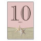 Starfish och burlap-tryckt bordsnummer-kort som uppfyller vår Beach Amore-inbjudan som ställts in på rosa, kan vara personlig och beställas individuellt. Alla delar av det här kortet skrivs ut. Det finns ingen riktig överlappning eller snäckor.
