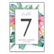 Dessa kort för bordsnummer i bröllop har tropiska blommigtar med vattenfärg i flera färg-skuggor av rosa och orange med handflatan löv. Använda mallen fält att anpassa med bordsnumren, namn och bröllop. Om du vill se matchande målbröllopsverkets svit går du till www.zazzle.com/dotellabelle Watercolor art and design by Victoria Grigaliunas