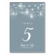Prisvärda utskrivna bordsnummer i bröllop med en enkel DIY-mall för anpassning. Den här chicen är utformad med strängar av glödande sträng ljus och burk på en dammig blå bakgrund. Anpassa varje bordsnummer som du behöver och lägg till varje enskilt i kundvagnen (observera: om du lägger till ett stort antal kort i kundvagnen kommer det att resultera i utskrift med samma nummer). Använda designen verktyg att välja typsnitt och färg som du vill ha eller ladda upp egna foton för att skapa en bra design för din bröllop-bord-dekanter!