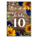 Bordsnumren Solros och marin Ro Rustic Bröllop. Med gult solblommor och marint blått ro över en bakgrund av jordgubbsodling.