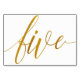 Bordsnummer 5: Det här kalligrafikortet för luxe-eleganten är inställt i en faux guld-bordsnummer. VIKTIGT: Det utseende på folie som visas är en tryckt effekt. Det är ingen riktig folie. Om du inte vill ha den här effekten kan du ta bort den på följande sätt: 1) Klicka på "Anpassa ytterligare". 2) Hitta den bild som står i z-guld-folie och ta bort den. Välj sedan ditt eget färg i färger i bakgrunden.