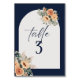Mörk blått bordsnummer, perfekt för bröllop och andra eleganter. som har vattenfärgade blommigtar i persiko- och trädgårdsblad. En enkel, men elegant contemporary botanisk design inspirerad av boho vintage stil. De här korten är dubblor. Enkel att anpassa. Matchningsinbjudan och andra bröllop-skrivbord finns tillgängliga.