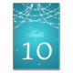 Bordsnumret i elegant bröllop är utformat med texten "" med mousserande strängturkos och anpassningsbar bordsnummer.