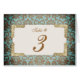 Elegant och ornat tittar detta vackra bordsnummer-kort för bröllopsmottagning i tält görs i ett rik akvarium och brunt antik tittar dammbad. Ett textområde med grädda färgader, i mitten, har grafik med ornate guld-dekorativa ställe-hållare på alla fyra hörnen. Text i en guldbrun är redo att anpassa för varje bord vid bröllop.