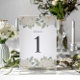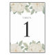 Chicens botaniska bordsnummer-kort innehåller gräns av vitt och elfenbensfärgat ro och mjukt löv i vattenfärgat mjukt färg som sätter bordsnumret i klassiskt grått-typsnitt. Att matcha "Vit ros-trädgårdsbröllopssamlingen".