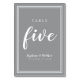 Denna utformning skapades för mindre intima bröllop firande. Enkel, minimalistisk och elegant bröllop-Bordsnummer FIVE-design har en contemporary med dubbla ram gräns i skarp vit på en sofistikerad grått-bakgrund. Chicens utformning är tidlös men ändå modern sofistikerad. Anpassa designen i bröllop bord med dina bröllop-detaljer i skarpa, vita bokstäver och skript. Kortets baksida är en dubblett av framsidan. Beställ en för varje bord med de enskilda bordsnumren. Bord ONE genom TEN är individuellt designade och finns i vår butik "bjudande in" på Zazzle. Om du behöver ytterligare nummer skapas du särskilt för en mindre plats, men skicka e-post till oss på InvitationSuites@gmail.com.