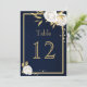 elegant anpassade bordsnummer kort vita blommor med ett marint bordsnummer i guld löv