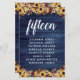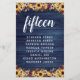 Budgetera sittkortet för bord till ditt bord med tryckt blått träskorn, solblommor och blommor i och burgundisk form samt grönsaks- och bärkvistar. Lägg till bordsnumret i ett charmerande calligraphy-skript tillsammans med gästernas namn i ett modernt teckensnitt.