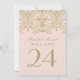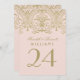 bordsnummer som inspirerats av vintage i elegant har ett bröllop monogram och en dekorativ gräns-design med ett metalliskt antique guld shimmer-utseende och lätt bakgrund för rosa färg. Tvåsidig design. Anpassa och lägg till varje bordsnummer-kort till din kundvagn individuellt.