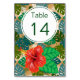 Hawaiianska temakort för bröllop bord. De har ditt bordsnummer i modern mörk grönt text, en djungel löv och ängar med gyllene bakgrund och en röd hibiscus blomma.