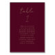 Den här eleganten har det moderna bröllop-bordsnumret-kortet ord "bord" i handskriftsskriptet guld-färgad på burgundbakgrund. Lägg till namnen för de gäster som tilldelats varje bord i guld-färgad sans serif-teckensnitt.