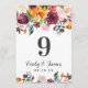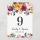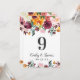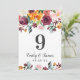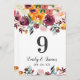 Rustiska romantiska kort för bordsnummer i bröllop har ett monogram och nummer som är inramat av en sommar- och fallfärgad gräns-utformning med vackra ro, dahlier, blommor och grönska, i en fantastisk höstpalett med burgröd, gyllene gult, persikofärgad orange, stil blommigt och nyanser.