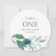 Kortet för grått bordsnummer i ett unikt runda format ramar med gräns i vår och sommarblad i blått, turkos och grönt över en skarp vit bakgrund. Teckensnittet anges i modern sans serif- och skripttypografi. Perfekt för trädgårdstemat bröllop. Om du vill se modernare utformning av bordsnumret för mottagning med löv går du till VG Inbjudan på Zazzle