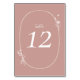 Ett bordsnummer i elegant bröllop har en svart typografi på en vit bakgrund, omgiven av en delikat ovalformad blomkrans.
