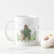 En vit mugg med en man som fiskar på en flodbank och hans hund bredvid honom och tittar på drakarna. Se även matchande lock, T-shirt, tote bag och födelsedagskort.