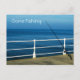 Fotografi av en fiskekapel som lutar sig mot rälsen på en fiskepir. Anpassadets text.