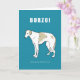 Hälsningkort med en illustration av ett Borzoianseende på en blåttbakgrund.