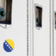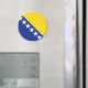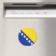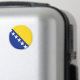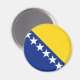 Flagga Bosnien och Hercegovina. Flagga Bosnien och Hercegovina har ett brett medelblått band för lodrät på flygsidan med en triangel för höger av gult som stänger av bandet och toppen av flagga. Resten av flagga är medelblått med sju femspetsiga vita stjärnor och två halvstjärnor över och grund längs triangelns hypotensiva användning. Triangelns tre punkter står för de tre folkgrupperna i Bosnien och Hercegovina: bosnier, kroater och serber. Det anses också representera karta i Bosnien och Hercegovina som ser ut som en triangel eller ett hjärta som vissa kallar det för en "hjärtformad nation". Stjärnorna, som representerar Europa, är tänkta att vara oändliga till antalet och fortsätter därför uppifrån och upp till grund. Flagga kännetecknas ofta av neutralitet och fred i färg - vit, blå och gult.