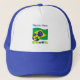 I truckerkepsen visas ord BRAZIL, i färg i den brasilianska flagga, som finns under flagga Brasilien. Ovanför är en fotboll, även i flagga färg. Själva flagga flyger ovanför och bakom allt. Lägg till en namn, i blått brev, ovanför designen för personlig. Bakgrunden är ljusblå.Roligt för att visa stöd för TEAM BRAZIL under fotbollsmöten i internationell och i världen. Underbar gåva till din brasilianska favorit. Roligt till bära till familjeåterföreningar och klubbar för idrott.