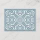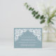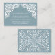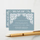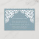 Designat för att samordna med vår Beaux Arts bröllop-samling i Tourmaline, har korten vit text på en dammig skifferblå bakgrund accentuerad med lacy white cutout stil som detaljerar i hörnen.